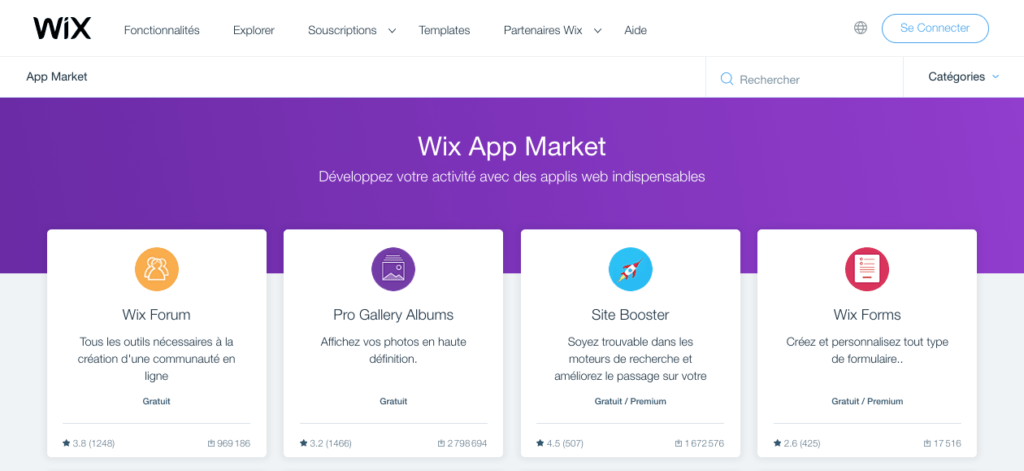 A la façon d’un Apple Store ou Google Store, Wix propose un catalogue d’applications gratuites ou payantes qui permettent d’améliorer votre site internet. Vous y ajoutez ainsi de nouvelles fonctionnalités : galerie d’images, réservation d’activité ou prise de RDV, etc. Seulement, ces fonctionnalités ne seront pas personnalisables en fonction d’un besoin spécifique.