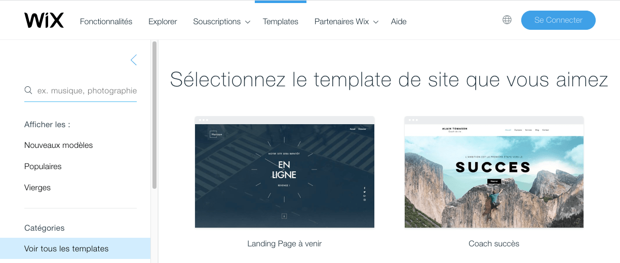 La bibliothèque de Wix propose un grand nombre de thèmes classés par catégories.