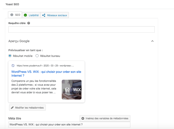 Avec l’option de base déjà comprise dans la plateforme, vous avez déjà quelques options intéressants. Mais tout l’intérêt sur le sujet est d’ajouter le plugin Yoast, très performant pour optimiser au mieux vos pages. Ce plugin est gratuit et en voici un aperçu :