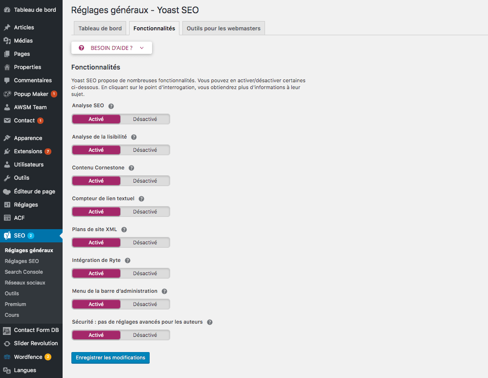 Une fois sur le back-office du site internet, on trouve sur la barre de menu à gauche divers onglets dont « SEO » : il faut alors cliquer sur « Réglages généraux » puis « Fonctionnalités ».
